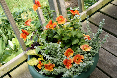 The brown glazed pot behind Jasmine (what's a post without a kitty picture?) was one of my favorites with that pretty yellow Calibrachoa, a Vancouver Centennial geranium (variegated leaves and red flowers) that I over-wintered from the previous year, the lovely dark-leaved Purple Knight (Alternathera), and Nemesia 'Sunsatia Mango'.